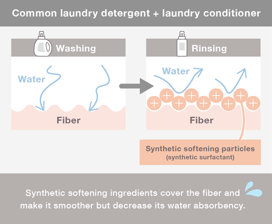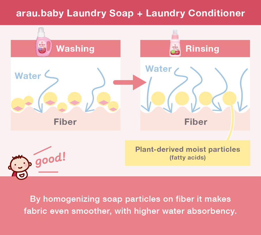 When used with arau.baby Laundry Soap, it makes fabric feel even softer and fluffier. It also improves absorbency, making it perfect for sweaty babies' underwear and clothes. With newborn babies' skin in mind, we have carefully avoided adding synthetic softening agents (synthetic surfactants) and synthetic fragrances.