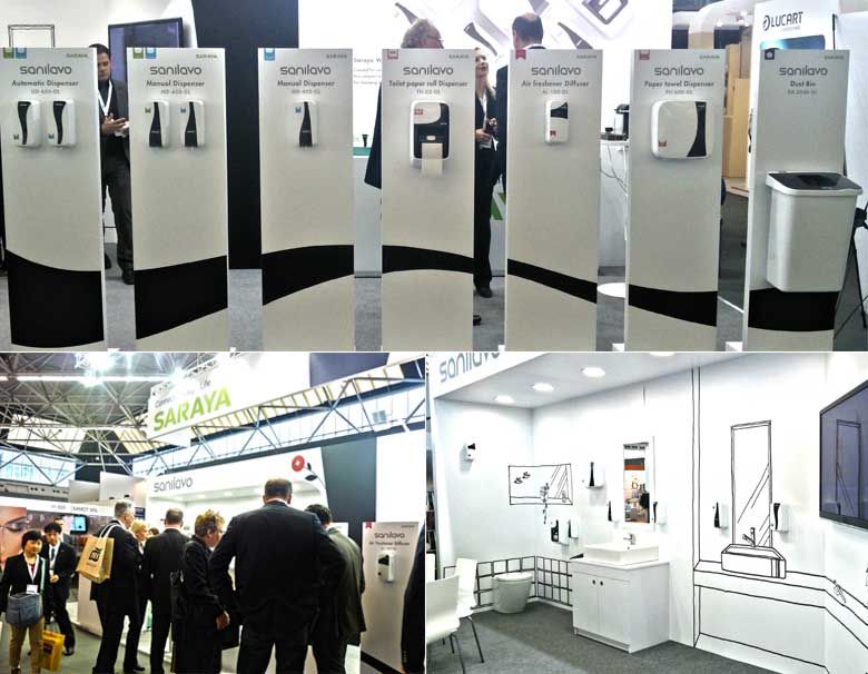 Saraya is proud to announce its successful attendance at the ISSA/Interclean Amsterdam 2014 held for 4 days from May 6th through May 9th. More than 650 companies worldwide exhibited at the event which attracted 28,000 international visitors from 130 countries this year. Saraya mainly showcased our new washroom amenity lineup "Sanilavo" which will debut in August. Its black and white stylish design reminiscent of Japanese brush strokes caught visitors' eyes and we were fortunate to be visited by as many as 350 people. Visitors showed great interest in the line up's usability as well as the model washroom built into the booth showing off Sanilavo's total washroom coordination.
